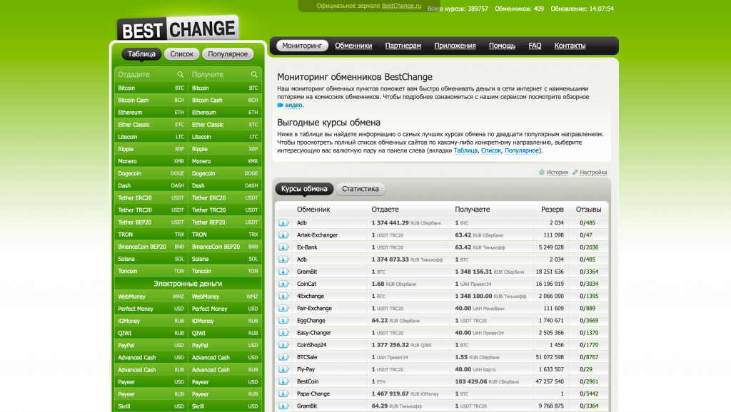 Bestchange — русскоязычный мониторинг криптообменников с рейтингом и отзывами. Проверка обменных пунктов, осуществляемая BestChange при включении в мониторинг, выполняется по множеству параметров и доказала свою эффективность. Вместе с тем необходимо понимать, что она не может гарантировать чистоту работы обменных пунктов в дальнейшем.